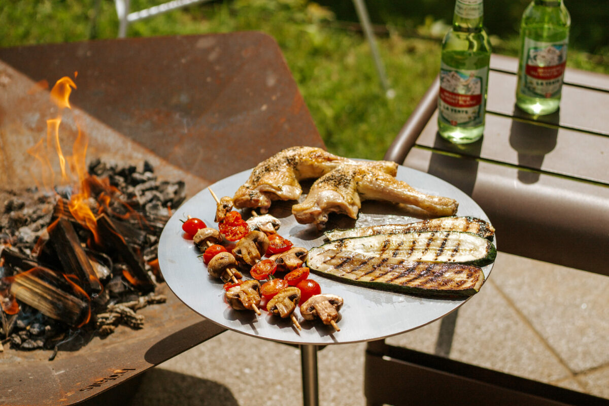 Les soirées apéritives, fromages à pâte dure, poulet et legumes grillés